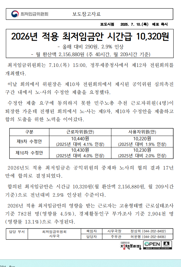 2026년 적용 최저임금안 시간급 10,320원 ( 290원, 2.9% 인상) 작성일25-07-16 15:52 조회48 목록 본문 2026년 적용 최저임금안 시간급 10,320원 올해 대비 290원, 2.9% 인상 월 환산액 2,156,880원 (주 40시간, 월 209시간 기준) 목록