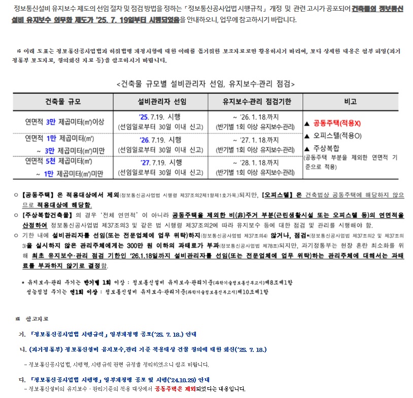 "건축물의 정보통신설비 유지보수 의무화" 본격 시행 안내 (단, 공동주택은 적용제외) 작성일25-07-31 17:30 조회44 목록 본문 "건축물의 정보통신설비 유지보수 의무화" 본격 시행 안내 (※ 공동주택은 적용제외) 목록