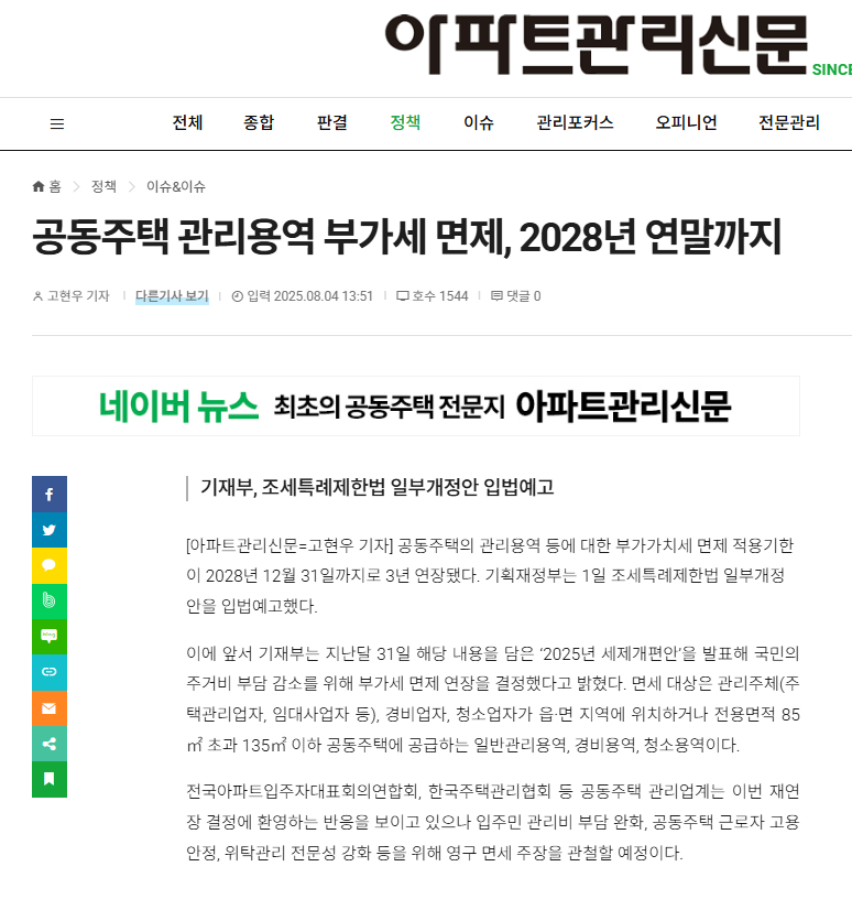 공동주택 관리용역 부가세 면제, 2028년 연말까지