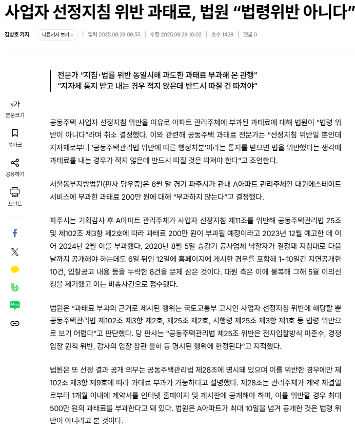 사업자 선정지침 위반 과태료, 법원 “법령위반 아니다” 취소 작성일25-09-30 15:32 조회32 목록 본문 연결 -> https://www.hapt.co.kr/news/articleView.html?idxno=166431 목록