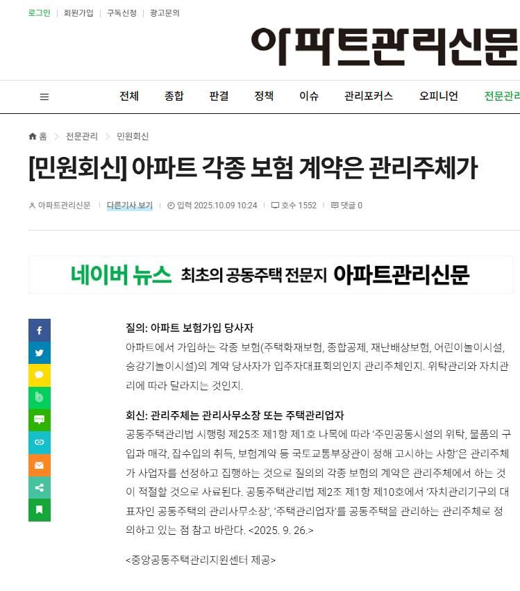 아파트 각종 보험 계약은 관리주체가... 작성일25-10-09 15:30 조회42 목록 본문 연결 -> https://www.aptn.co.kr/news/articleView.html?idxno=110269 목록