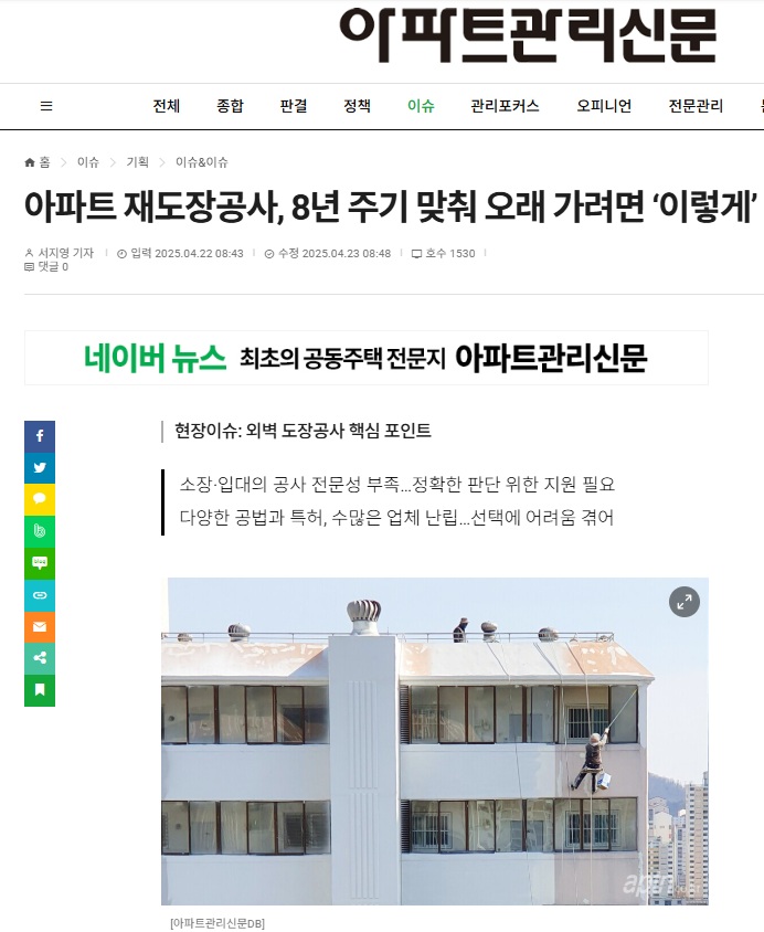 아파트 재도장공사, 8년 주기 맞춰 오래 가려면 ‘이렇게’ 작성일25-04-23 18:45 조회66 목록 본문 https://www.aptn.co.kr/news/articleView.html?idxno=109092 [연결] 목록