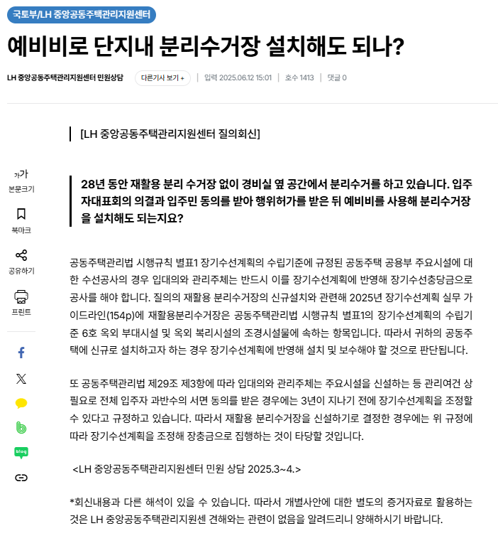 예비비로 단지내 분리수거장 설치해도 되나? 작성일25-06-24 11:35 조회49 목록 본문 연결 https://www.hapt.co.kr/news/articleView.html?idxno=165580 목록
